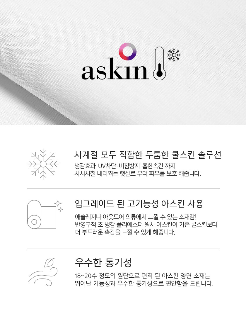 -아스킨은 기능성 냉감 원단으로 제작되어 햇볕아래에서도 시원하게 체온유지를 해주는 여름 필수 아이템 이에요 :)