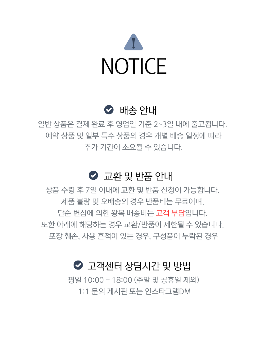 - 상품 하자, 오배송의 경우 수령일로부터 7일 이내 고객센터 접수 후 교환∙반품이 가능합니다. (교환/반품비 무료)