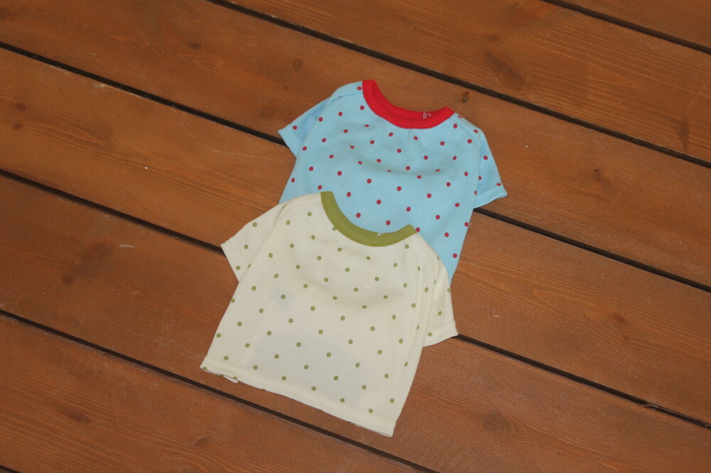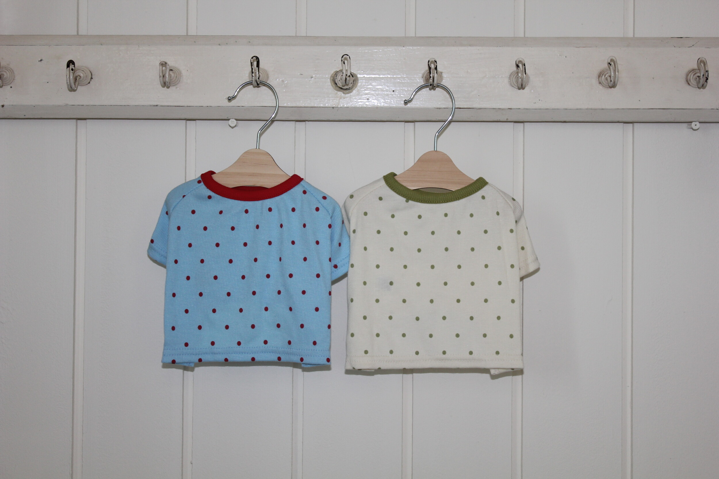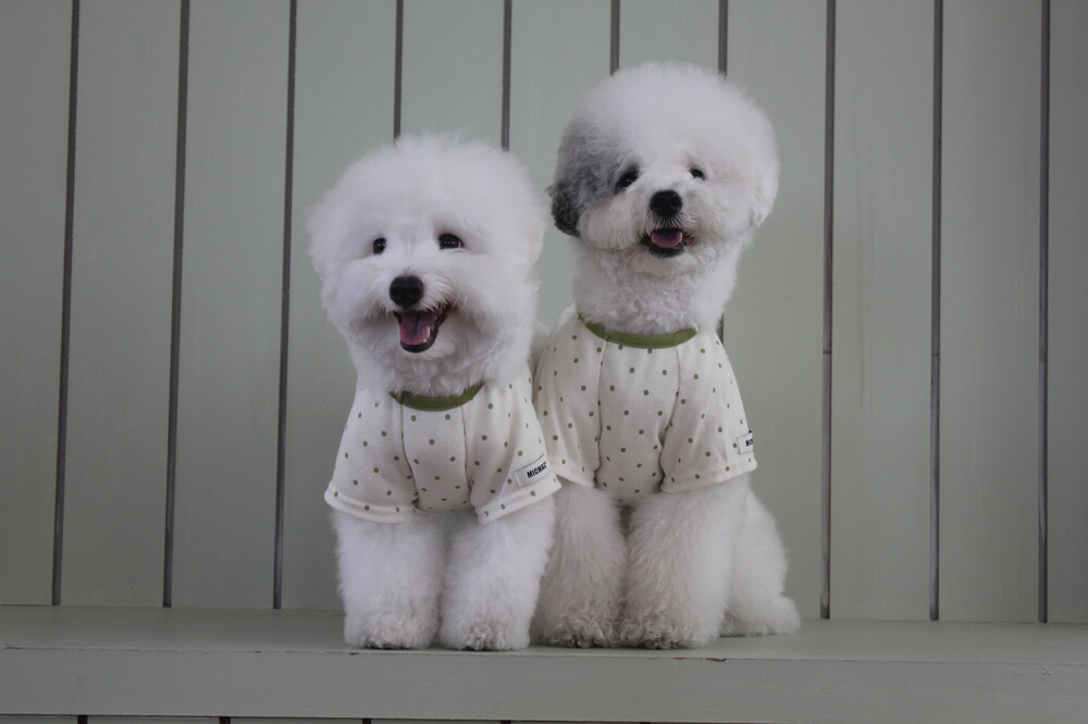 잔잔한 땡땡이 패턴에 선명한 넥 배색이 포인트 !